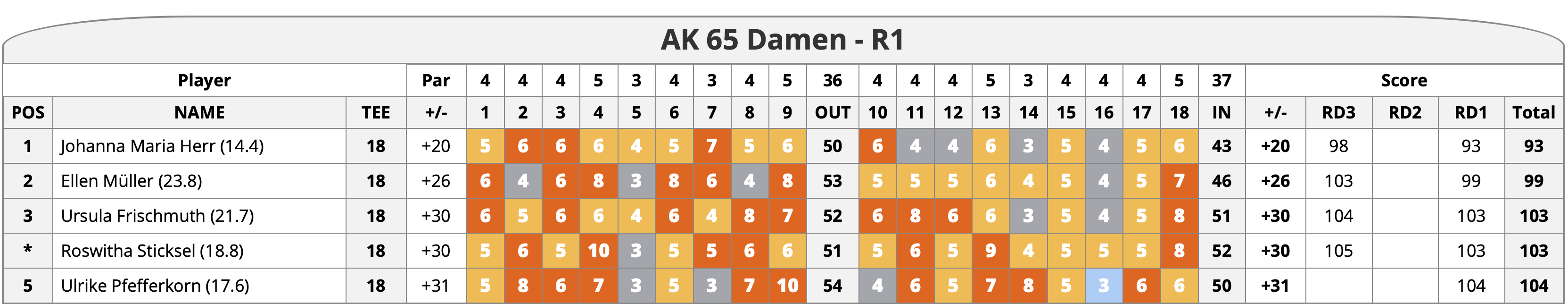 Konstanz - das „Schlagwort“ dieser Clubmeisterschaften - auf ganzer Linie auch bei den Damen der AK65, sowohl in den Einzelleistungen wie auch im Tabellenstand. Johanna Maria Herr spielte nach ihrer „93“ am Freitag im Finale eine 98, Ellen Müller (Freitag 99) eine“103“ und Ursula Frischmuth (Freitag 103) eine „104“.