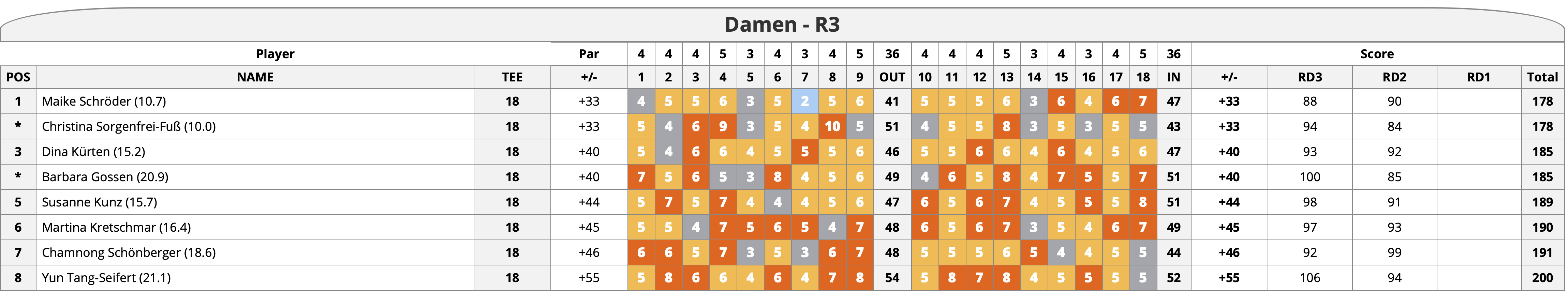 Ebenfalls knapp auch das Samstagsergebnis bei den Damen. Christina Sorgenfrei-Fuß führte mit einer 84er-Runde die Tabelle an - vor Barbara Gossen (+12) und Maike Schröder (+17), dicht gefolgt von sieben weiteren Damen.