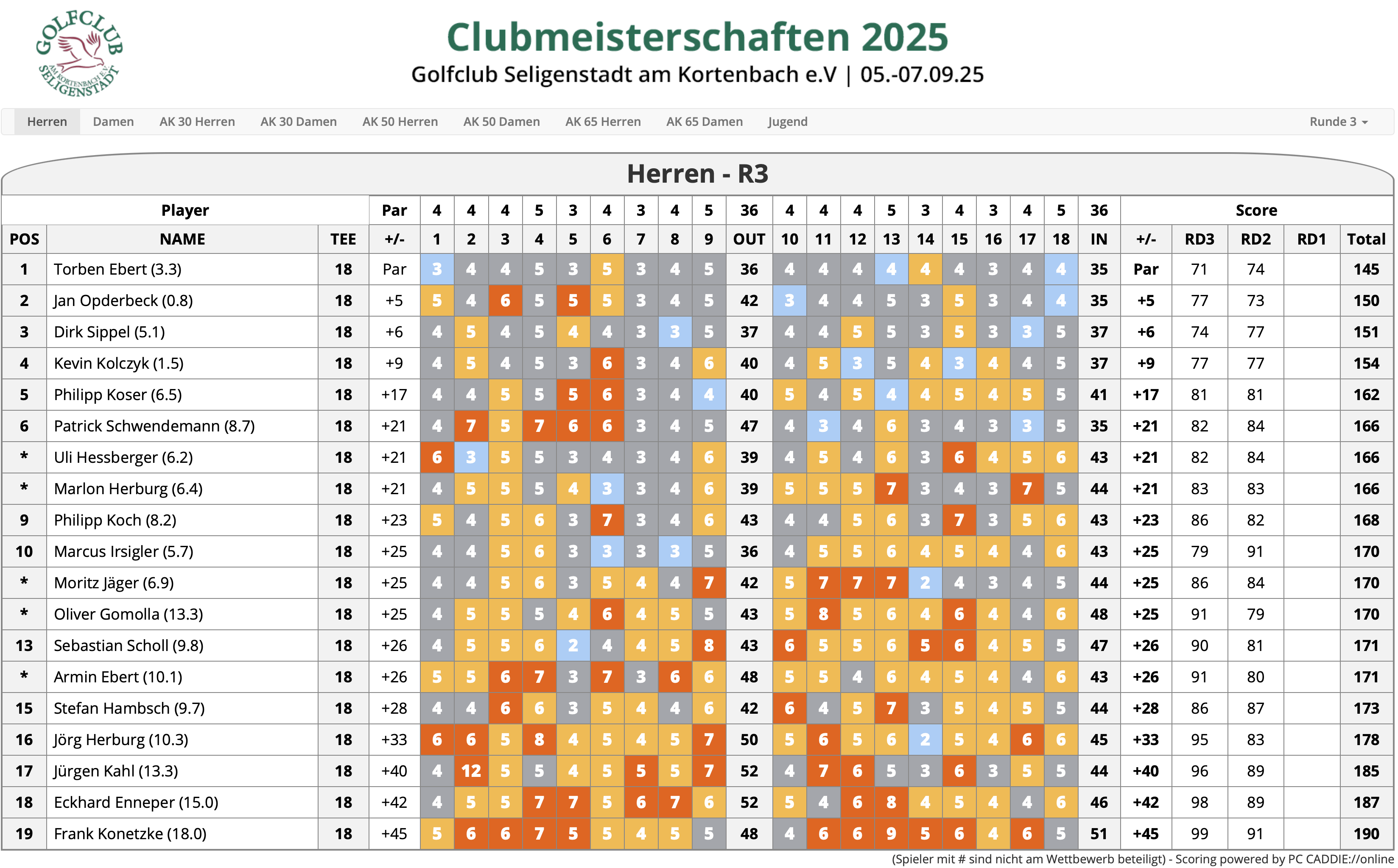 Bei den Herren empfahl sich nach der Samstagsrunde, die wegen Nebels mit einer 30minütigen Verspätung startete, der seit drei Jahren amtierende Clubmeister Jan Opderbeck mit einer Rundenergebnis „Par“ für den vierten Titel. Ihm folgte allerdings - knapper gehts nicht - mit „1 über Par“ Torben Ebert vor Kevin Kolczyk und Dirk Sippel mit „+4“. Der Sonntag der Herren versprach erneut spannend zu werden.