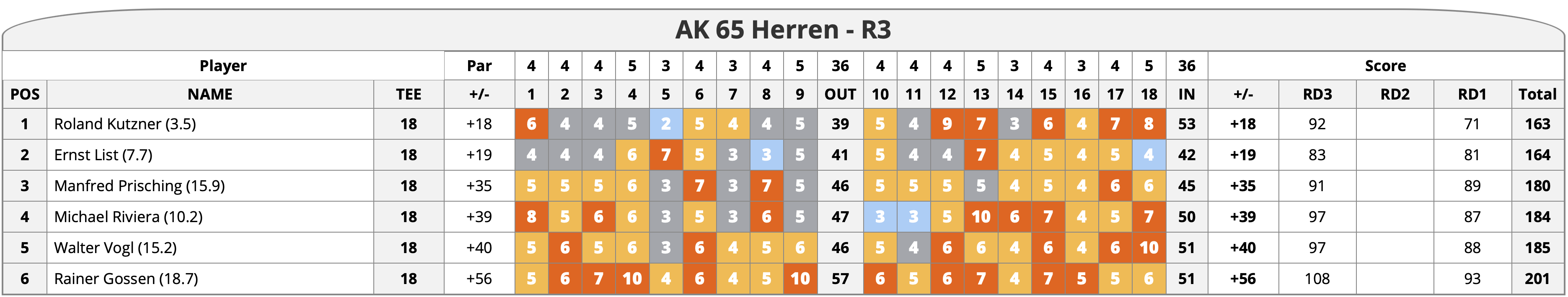 Bei den Herren der AK65 musste Roland Kutzner nach seiner 71er-Freitagsrunde am Sonntag eine „92“ verschmerzen, die seinen Abstand auf den konstant spielenden Ernst List (81+83) auf „1“ Schlag schmelzen ließ. Mit seinem Spiel auf ebenso konstantem Niveau (89+91) schob sich Manfred Prisching vom freitagsfünften auf den dritten Tabellenplatz.